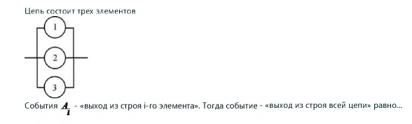 Цепь состоит трех элементов. События А - "Выход из строя i-го элемента". Тогда событие - "выход из строя всей цепи" равно