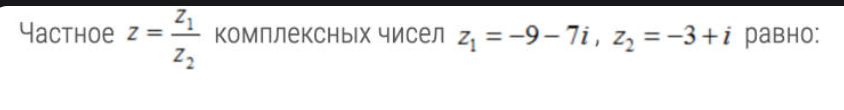 Частное z = z1/z2 комплексных чисел z1 = -9-7i, z2= -3+i равно: