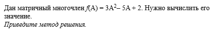 Дан матричный многочлен f(A) = 3A2– 5A + 2. Нужно вычислить его 2 значение.