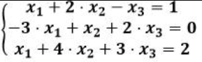 Дана система уравнений {x₁ + 2 ⋅ x₂ − x₃ = 1, −3 ⋅ x₁ + x₂ + 2 ⋅ x₃ = 0, x₁ + 4 ⋅ x₂ + 3 ⋅ x₃ = 2