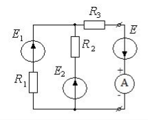 Дано: R1 = 4 Ом, R2 = 12 Ом, R3 = 1 Ом, E1= 8 В, E2 = 40 В. Определить ЭДС F, чтобы ток амперметра был равен нулю.