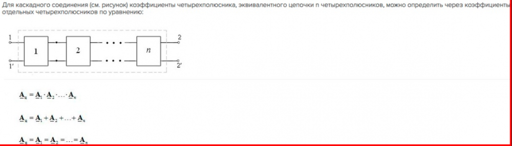 Для каскадного соединения (см. рисунок) коэффициенты четырехполюсника, эквивалентного цепочки п четырехполюсников, можно определить через коэффициенты отдельных четырехполюсников по уравнению: