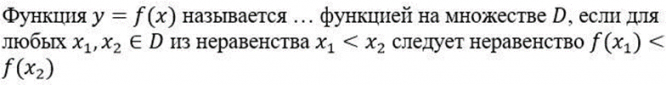 Функция y = f(x) называется ... функцией на множестве D, если для любых х1, х2 € D из неравенства x1 < x2 следует неравенство f(x1) < f(x2)