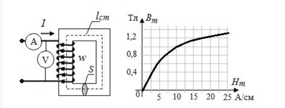 Катушка с магнитопроводом подключена к источнику синусоидального напряжения. Показание вольтметра 220 В, частота f=50 Гц. Средняя длина магнитопровода = 100 см, площадь поперечного сечения S = 100 см, число витков обмотки w=100. Пренебрегая гистерезисом, рассеянием, активным сопротивлением обмотки, используя расчет по действующим значением, определить показание амперметра. Зависимость амплитуды индукции в магнитопроводе от амплитуды напряженности магнитного поля Вт(Нт) задана. ![]()