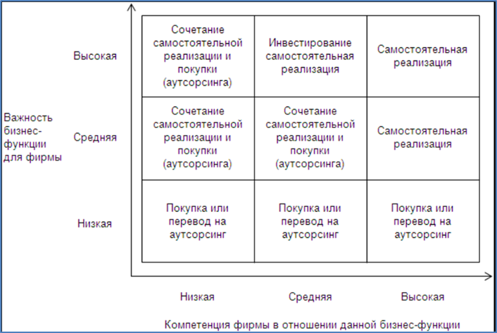 На рисунке ниже изображена схема перераспределения бизнес-функций в зависимости от наличия корневых компетенций. Определите, какие действия стоит предпринять фирме в отношении периодического юридического сопровождения деятельности при условии его высокой важности и крайне низкой компетенции организации в его отношении.