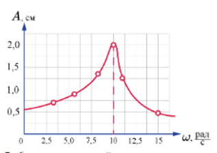 На рисунке представлена зависимость амплитуды колебаний груза на пружине от частоты внешней силы. Максимальная скорость в этой системе равна ... м / с.