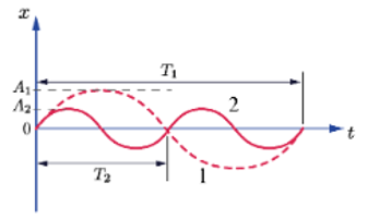 На рисунке представлены графики гармонических колебаний материальных точек одинаковой массы, А1 = 2*A2. Соотношение энергий W колеблющихся точек: