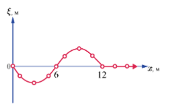 На рисунке приведена моментальная «фотография» модели плоской поперечной гармонической волны в момент времени t = 6 с. Источник колебаний находится в точке с координатой х = 0. В начальный момент времени (t = 0) все частицы среды находились в покое. Циклическая частота волны равна ... рад /с.
