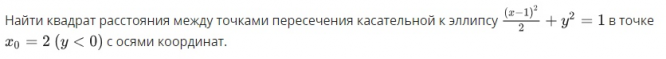 Найти квадрат расстояния между точками пересечения касательной к эллипсу в точке с осями координат.