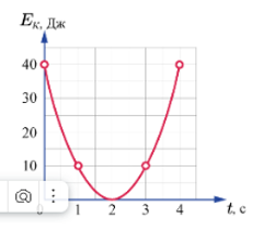 На рисунке показан график зависимости кинетической энергии тела от времени в течение полета. Максимальная скорость тела в первые четыре секунды полета равна