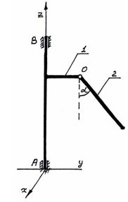 Невесомый стержень 1 и однородный стержень 2 массы 3 кг вращаются с постоянной скоростью 2 рад/с вокруг вертикальной оси. Угол наклона 30 град. Длины стержней L1=0,5 м, L2=1 м. Найти модуль главного вектора сил инерции, действующих на второй стержень., относительно точки О.