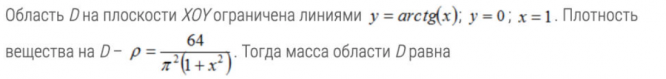 Область D на плоскости XOY ограничена линиями у = arctg(x); y =0; x = 1 . Плотность вещества на D – p = 64/(п2(1+x2). Тогда масса области D равна