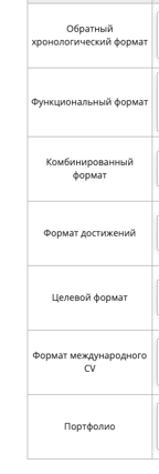 Перед Вами набор описаний и составляющих резюме. Определите, какие из них относятся к какому формату. Вам необходимо перенести описания и составляющие в соответствующие колонки.