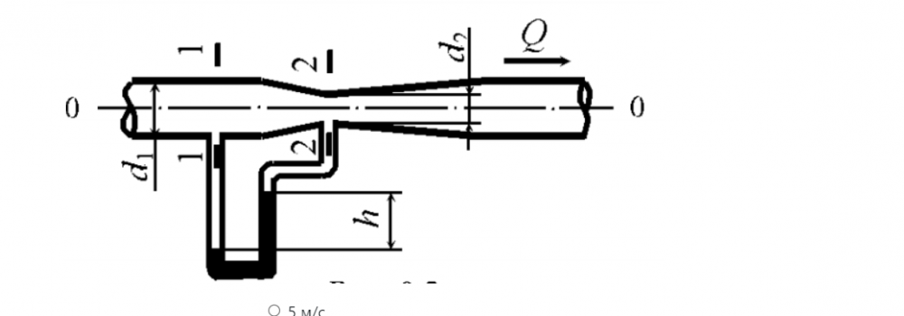 По горизонтальному трубопроводу переменного сечения движется жидкость (рис.), плотность которой 700 кг/м3 . Диаметр в сечении 1-1 трубопровода d1 = 5 см, а в сечении 2-2 d2 = 2 см, разность уровней в дифференциальном манометре, заполненном глицерином плотностью 1250 кг/м3 , составляет h = 28 см. Определить скорость движения жидкости в сечении 2-2 трубопровода. Потери напора не учитывать.