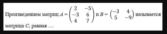 Произведением матриц A = ((2, −5), (−3, 6), (4, 7)) и B = ((−3, 4), (5, −9)) называется матрица C, равная … @4,1.pngТип ответа: Одиночный выбор • с выбором одного правильного ответа из нескольких предложенных вариантов