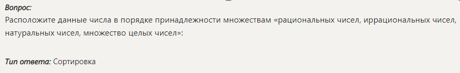 Таким образом, чтобы расположить числа в порядке принадлежности к множествам, сначала определяем, к какому множеству принадлежит каждое число, а затем записываем их в порядке: