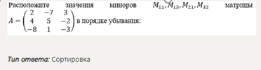 Расположите значения миноров М11 М13, М21, М22 матрицы А 2 -7 3 А=4 -8 5 -2 в порядке убывания: 1 -3,