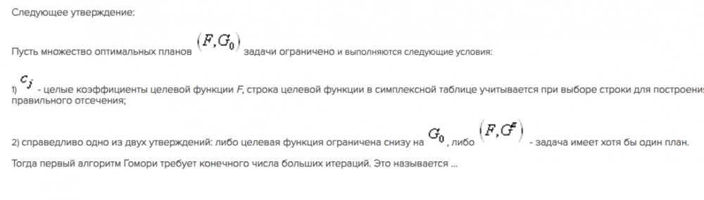 Теорема о конечности первого алгоритма Гомори.Эта теорема утверждает, что если условия задачи удовлетворяют определенным критериям (в данном случае, ограниченность множества оптимальных планов и целевой функции), то алгоритм Гомори завершится за конечное число итераций.