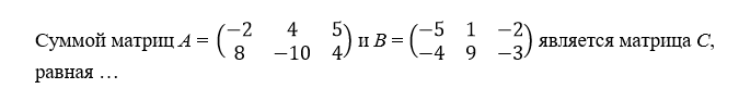 Суммой матриц А= -2 4 5 8 -10 4 и В= -5 1 -2 -4 9 -3 является матрица С, равная ...
