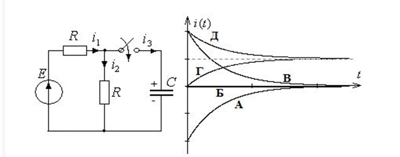 Указать кривую переходного тока i2(t) после коммутации (uC(0+) = E). ![]()