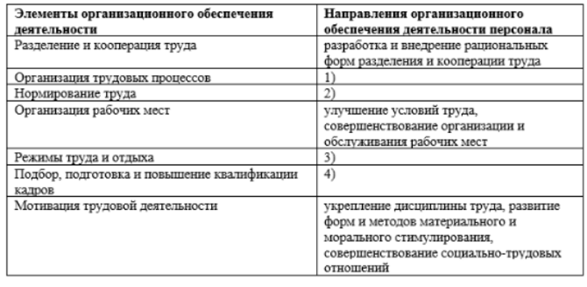 В таблице ниже приведены элементы организационного обеспечения деятельности. 1)Улучшение организации подбора, подготовки и повышения квалификации кадров; 2) совершенствование нормирования труда; 3) рационализация режимов труда и отдыха; 4) рационал...