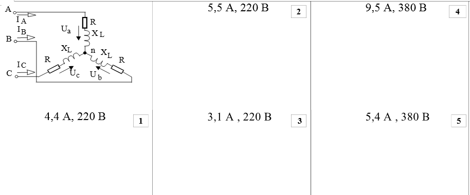 В трехфазную сеть c U л = 380 В включены активно-индуктивные приемники R= 30 Ом и X = 40 Ом, соединенные трехпроводной звездой. Токи I a и напряжение U a, соответственно, равны: (выбрать один правильный ответ из пяти и в поле ввода ввести целое число от 1 до 5, без пробелов)
