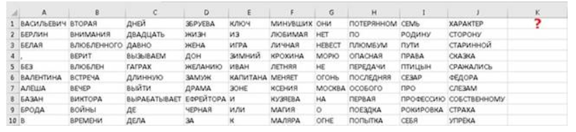 - После объединения всех значений с пробелами между ними, получившаяся строка будет записана в ячейку K1.