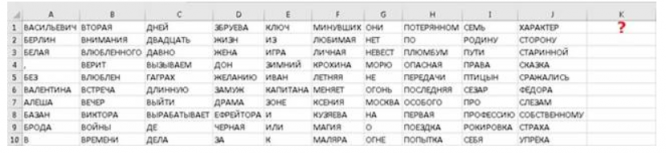 В ячейки A1:J10 поместили слова и знаки препинания (см. рисунок) В ячейку K1 ввели формулу: =F9&" "&D9&" "&E8&" "&A3 Определите и введите значение, которое появится в ячейке K1 после нажатия клавиши Enter. Примечание: для...