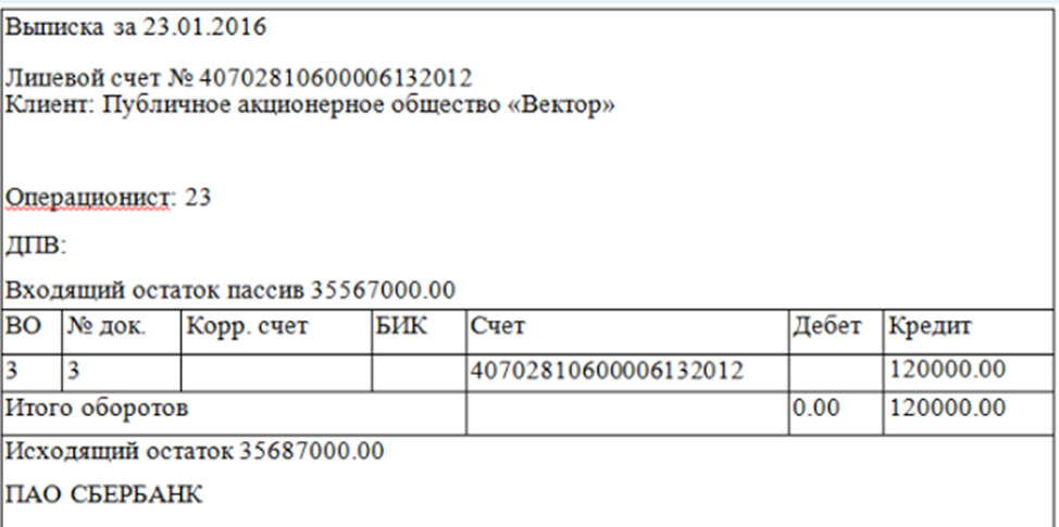 24.01.2016 г. бухгалтером ПАО «Вектор» получена выписка банка ПАОСбербанк» № 3 о зачислении 23.01.2016 на расчетный счет ПАО «Вектор» 120000.00 руб. наличных денежных средств предприятия, сданных ранее бухгалтером в банк.