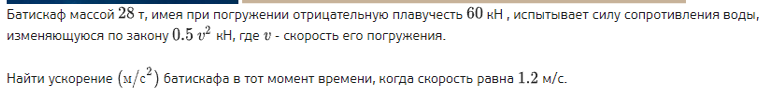 Батискаф массой 28 т, имея при погружении отрицательную плавучесть 60 кН , испытывает силу сопротивления воды, изменяющуюся по закону 0.5 кН, где v - скорость его погружения.