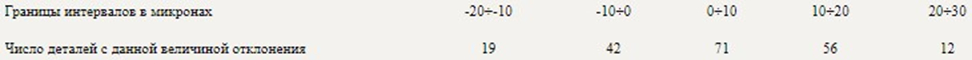 Были исследованы 200 готовых деталей на отклонения истинного размера от расчетного. Сгруппированные данные приведены в следующей таблице: