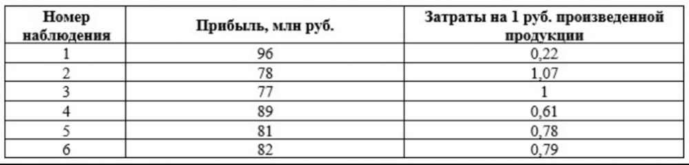 Были получены выборочные данные о деятельности шести коммерческих фирм. На основании полученных данных оцените тесноту связи между прибылью (млн руб.) и затратами на 1 руб. произведенной продукции.