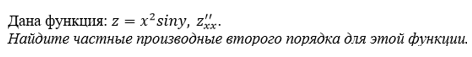 Для нахождения частных производных второго порядка функции, сначала необходимо определить, что именно представляет собой функция, заданная в вашем вопросе. Предположим, что функция имеет вид: