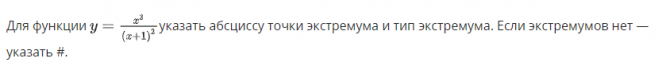 Для функции указать абсциссу точки экстремума и тип экстремума. Если экстремумов нет - указать #.