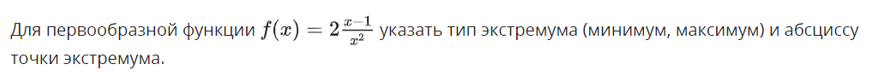 Для первообразной функции указать тип экстремума (минимум, максимум) и абсциссу точки экстремума. Тип экстремума: