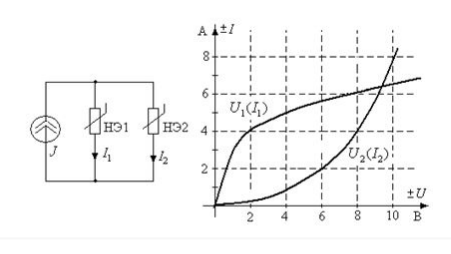 Два нелинейных элемента, вольтамперная характеристика которых задана на рисунке, соединены параллельно. Ток источника на входе J= 6 А. Определить напряжение на нелинейных элементах.