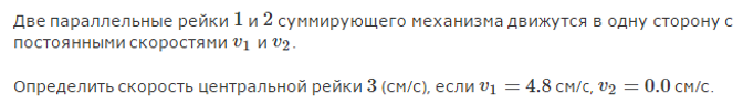 В механике, когда у нас есть два параллельных механизма, которые движутся с определенными скоростями, скорость центрального механизма можно рассчитать как среднее арифметическое скоростей двух других механизмов. Но в данном случае, так как одна из рейк (рейка 2) имеет скорость 0, нам нужно учитывать только скорость первой рейки.