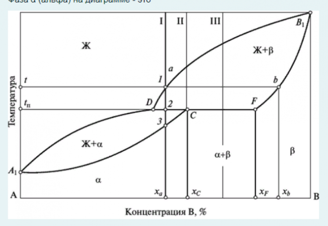 - Конкретный пример: Если фаза α на диаграмме находится в области, где компонент В растворен в компоненте А, то она обозначает твердый раствор компонента В в А.