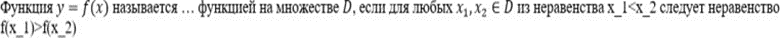 Функция у = f(x) называется ... функцией на множестве D, если для любых х1, х2 € D из неравенства х_1<x_2 следует неравенство f(x_1)>f(x_2)