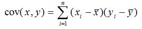 Cov(x, y) = (1/n) * Σ((xi - x̄) * (yi - ȳ))