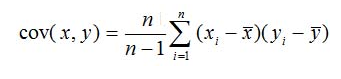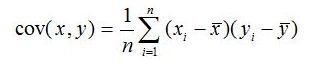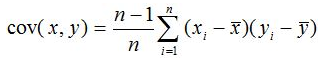 Ковариация между выборками х = (x1, x2,....xп) и у= (y1, y2,...yп), вычисляется по формуле: