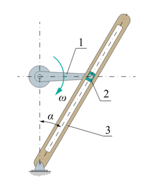 Кривошип 1 кривошипно-кулисного механизма вращается с постоянной угловой скоростью w = 5.5 рад/с, a = 25°