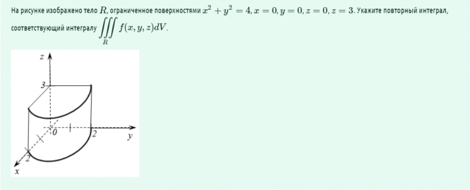 На рисунке изображено тело R, ограниченное поверхностями x2+y2=4, x=0, y=0, z=0, z=3. Укажите повторный интеграл, соответствующий интегралу ∭Rf(x,y,z)dV.