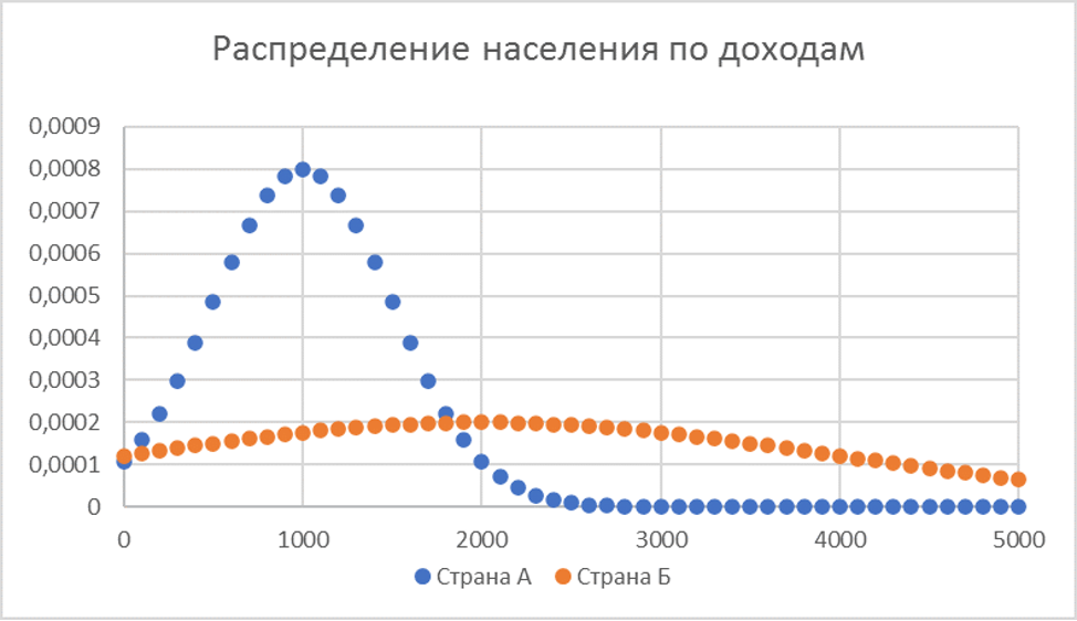 На рисунке ниже приведены кривые нормального распределения доходов населения стран А и Б.