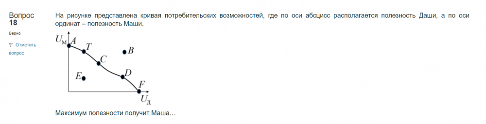Ответ: Маша получит максимум полезности в точке A или F, если в ее наборе будут оба блага. Если одно из благ отсутствует, то максимум полезности не будет достигнут.