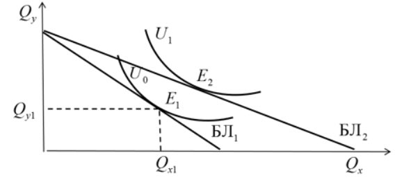 На рисунке представлены две бюджетные линии (БЛ1 и БЛ2) одного и того же потребителя и кривые безразличия после изменения цены товара х.