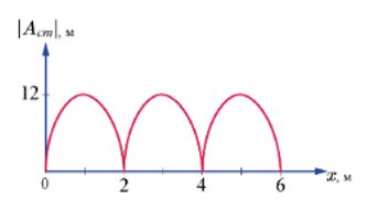 На рисунке приведен график зависимости модуля амплитуды стоячей волны от координаты x. Амплитуда бегущей волны равна ... м.