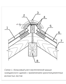 На схеме 1 представлен узел конька неутепленной крыши гражданского здания с применением хризотилцементных волнистых листов в качестве кровельного покрытия.