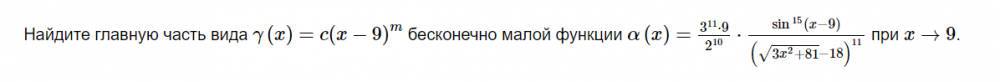 Найдите главную часть вида γ(x)=c(x−9)m бесконечно малой функции α(x)=311⋅9/210⋅sin 15(x−9)(3x2+81√−18)11 при x→9