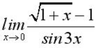 lim (√(1 + x) − 1) / sin(3x) = lim (f'(x) / g'(x)) = lim (1 / (2√(1 + x)) / (3cos(3x)).